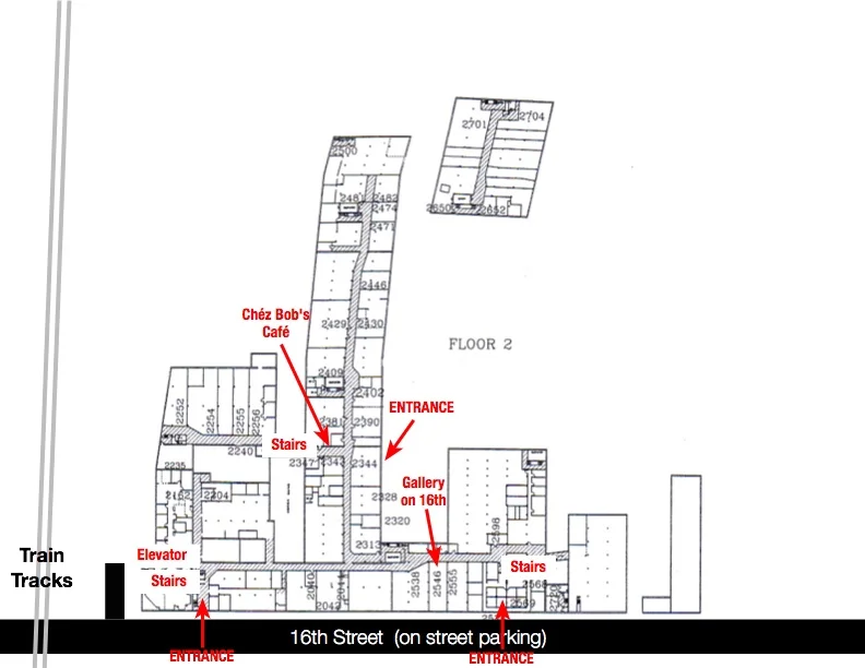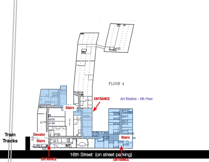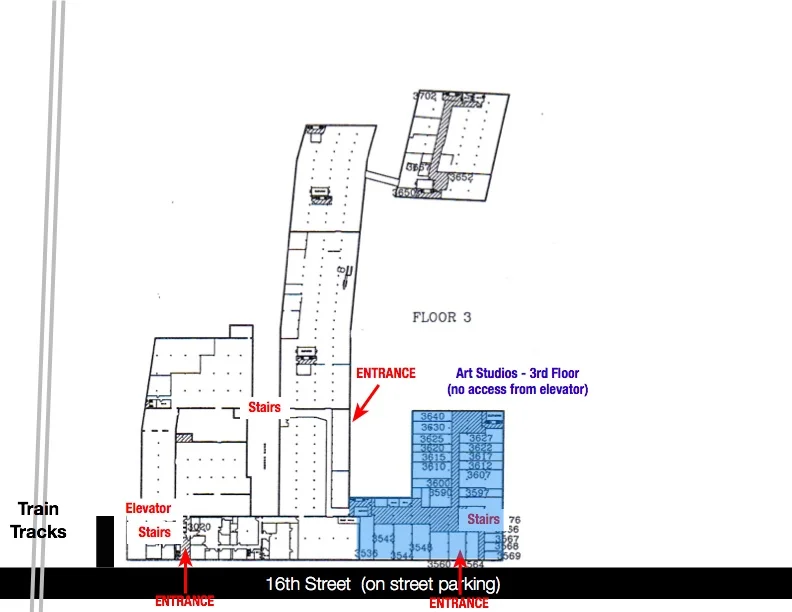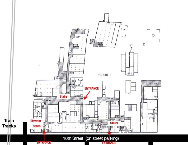 The main entrances for the building are from 16th Street at the 1405 entrance, and the 1515 entrance (look for the tan canopy for each.) Each entrance has a stairwell which will get you to each floor. The 1405 entrance is the only entrance with a passenger elevator. Please note that you can not access the 3rd floor artists studios from the passenger elevator or the stairs at the 1405 entrance.